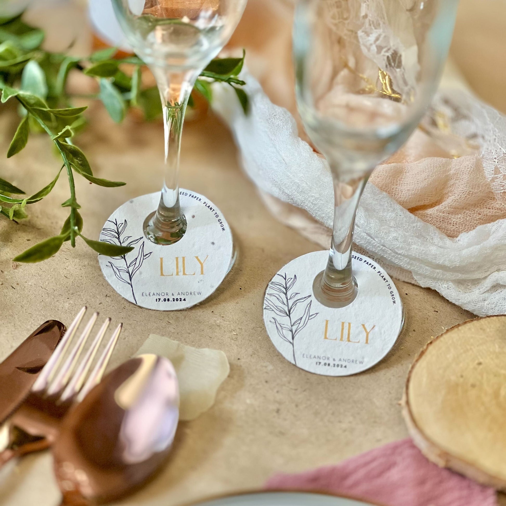 Make your wedding even more special with our eco-friendly and charming plantable Wine Glass Name Tags. These keepsakes will not only add beauty to your celebration but can also be planted to create long-lasting memories for your guests.